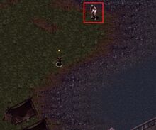 After dismissing certain followers or otherwise having them wait for too long to the point where they leave for their original spot, they may not actually get there due to odd pathing issues. For example, dismissing Virgil and Sogg Mead Mugg will at certain times get them stuck in a tile just north of the Shrouded Hills bridge, presumably at the same tile where Lukan dissapears after persuading him to leave. It seems that they both have to cross Shrouded Hills on their way back to their spawn points, but get stuck there on the way for one reason or another. (see the picture to the right to see where they end up - note the tents at the bottom near the bridge if you wish to find the exact spot)